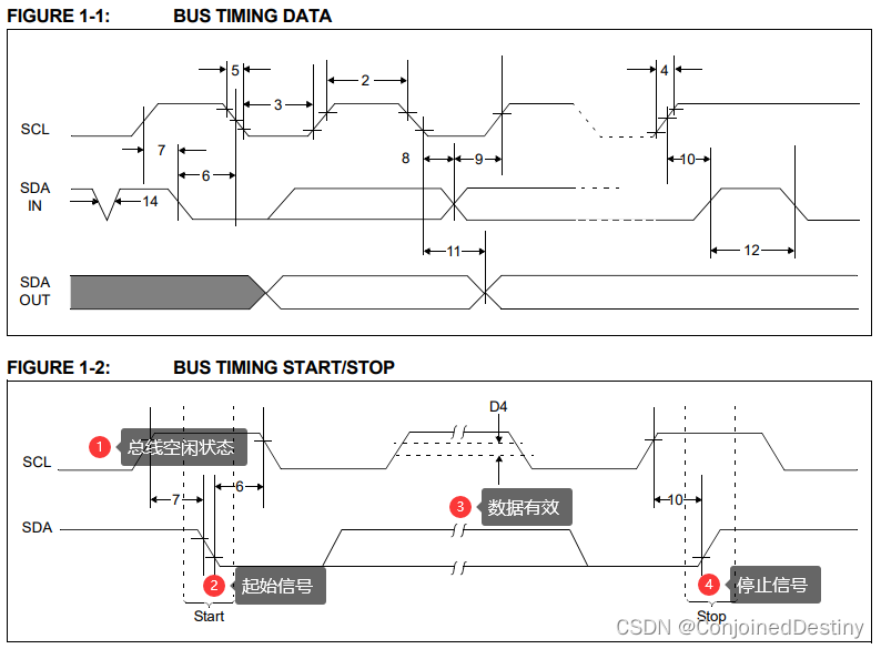 (4) 图中标注④表示“停止信号”,完成数据读写后,串口时钟 SCL 保持高电平,当串口数据信号 SDA 产生一个由低电平转为高电平的上升沿时,产生一个停止信号,I2C 总线跳转回“总线空闲状态”。