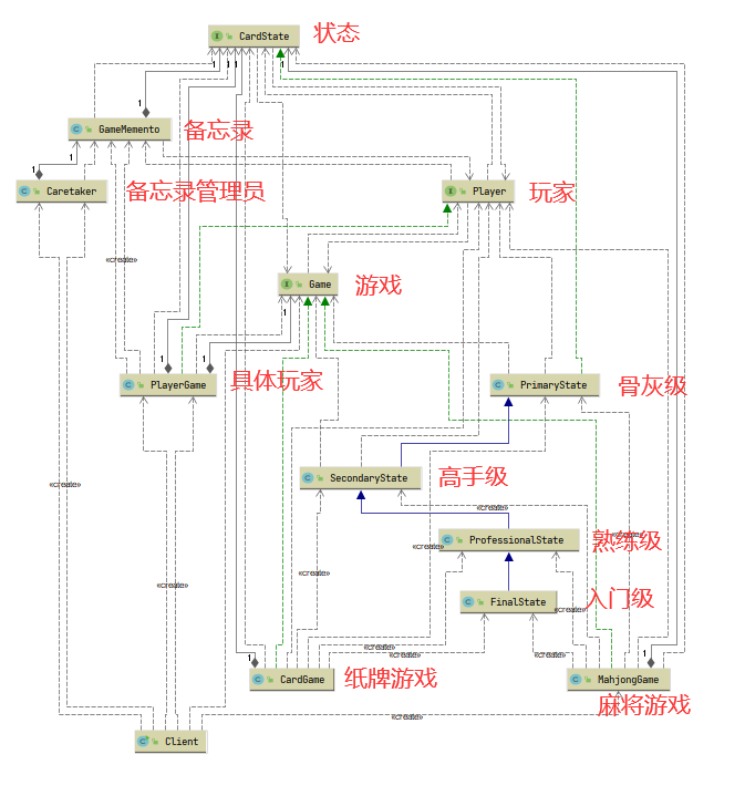 public class MahjongGame implements Game {private CardState primaryState, secondaryState, professionalState, finalState;//入门级,熟练级,高手级。 小于100入门级,100到500熟练级,500到1000高手级, 大于1000骨灰级private static double winningProbability = 0.5; //赢的概率public MahjongGame() {primaryState = new PrimaryState();secondaryState = new SecondaryState();professionalState = new ProfessionalState();finalState = new FinalState();}/*** 玩游戏,赢了加分,输了减分* @param amount* @param player*/@Overridepublic void play(double amount, Player player){CardState currencyState = player.getCurrencyState();boolean result = currencyState.play(winningProbability);if(result){//赢了加分System.out.println(player.getName() + "打麻将赢了!");currencyState.addScore(this, player, amount);}else {//输了减分System.out.println(player.getName() + "打麻将输了!");currencyState.reduceScore(this, player, amount);}}@Overridepublic void addScore(Double addScore, Player player){Double score = player.getScore();if(score == null){score = addScore;}else{score += addScore;}CardState currencyState;if(score < 100){currencyState = primaryState;}else if(score >= 100 && score < 500){currencyState = secondaryState;}else if(score >= 500 && score < 1000){currencyState = professionalState;}else{currencyState = finalState;}player.setCurrencyState(currencyState);player.setScore(score);System.out.println(player.getName() + "当前分数为:" + score + " 当前级别为:" + currencyState.getClass().getSimpleName());}}