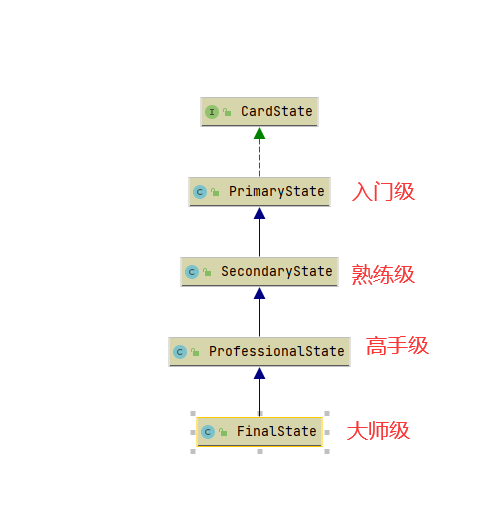 然后创建状态类,入门级,熟练级,高手级,骨灰级,状态之间从低到高依次继承上一级。类图表示为: