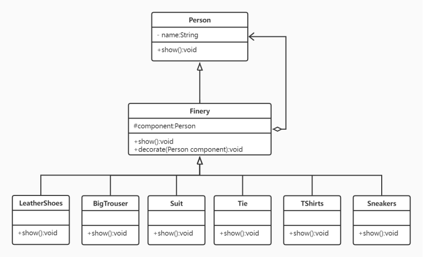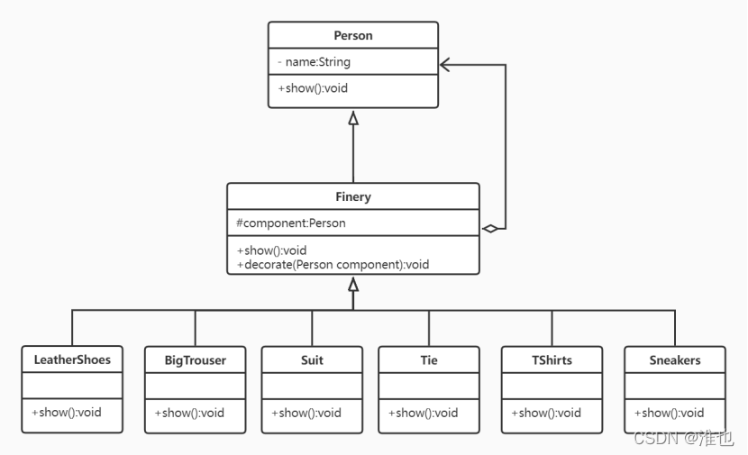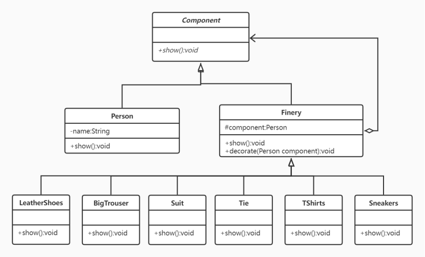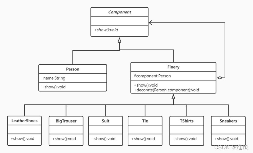 所有组件都是Component 的子类,由Component 规划行为(如,public void show();),装饰类Decorator 与被装饰类Person 都是Component的子类,具有相同的行为。