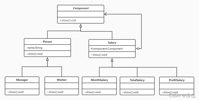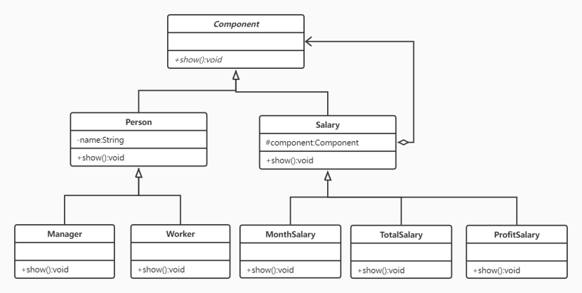 public class Test {public static void main(String[] args) {Component manager=new Manager("老张");Component worker=new Worker("小李");Salary s1=new MonthSalary(new PronfitSalary(manager));s1.show();Salary s2=new MonthSalary(new TotalSalary(worker));s2.show();}}