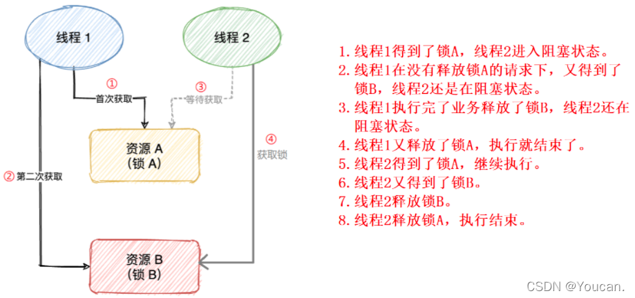}输出:线程1:得到锁A线程1:得到锁B线程1:释放锁B线程1:释放锁A线程2:得到锁A线程2:得到锁B线程2:释放锁B线程2:释放锁A