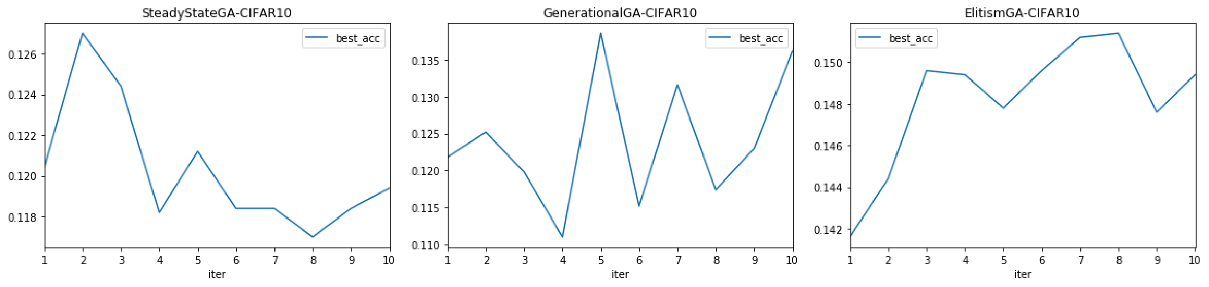 三种遗传算法在CIFAR10数据集上的表现如下。