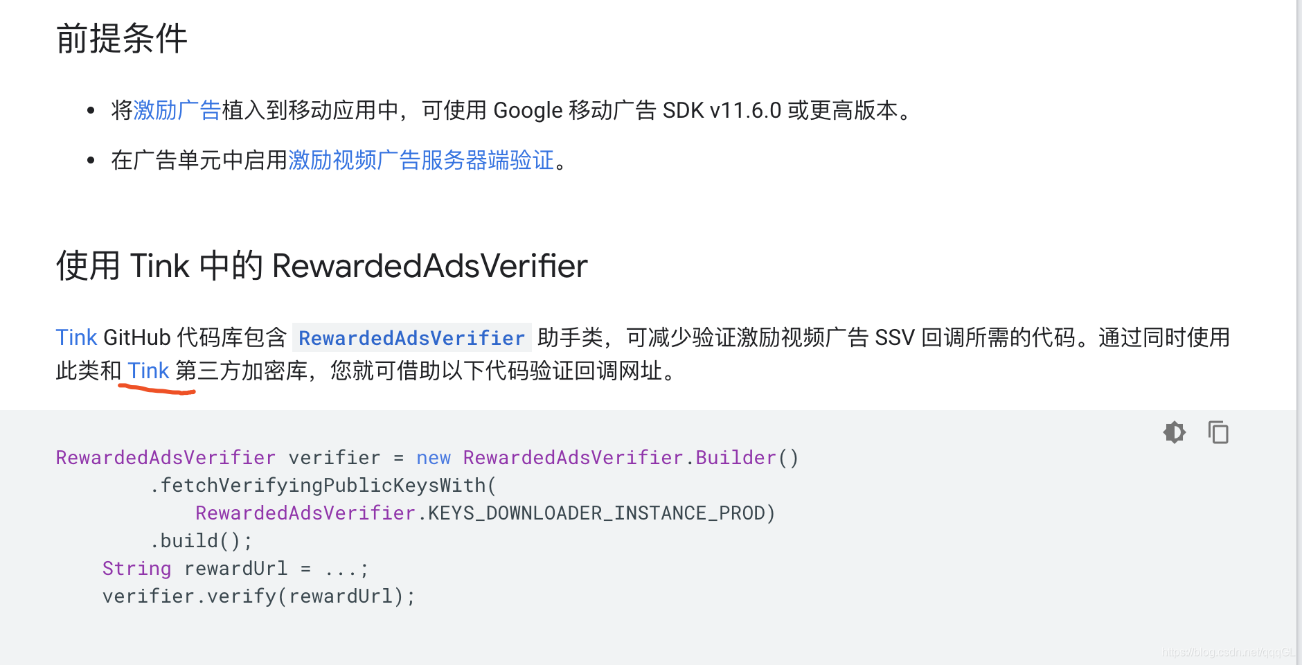 接入AdMob的奖励视频广告服务端的验证,这里指的用户观看完广告发奖励的通知验证。进入谷歌的文档说明