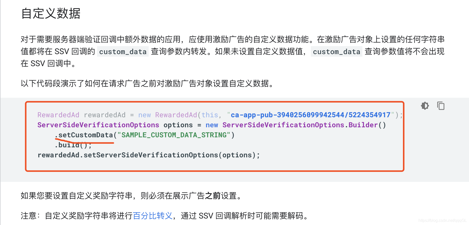| custom_data | 自定义数据字符串,其提供方法为 setCustomData。 如果应用未提供自定义数据字符串,此查询参数值将不会出现在 SSV 回调中。 | SAMPLE_CUSTOM_DATA_STRING |