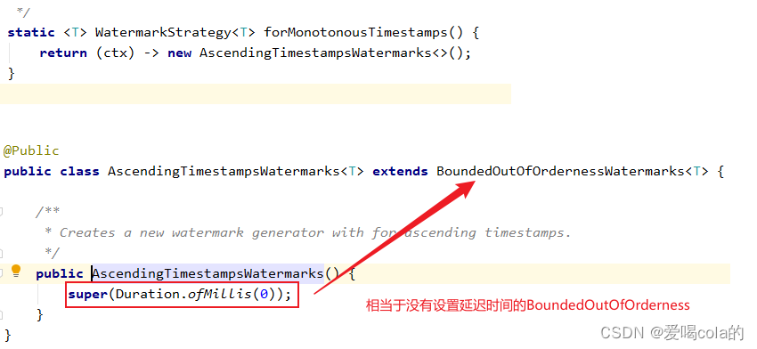 forMonotonousTimestamps使用AscendingTimestampsWatermarks类来实现,AscendingTimestampsWatermarks继承自BoundedOutOfOrdernessWatermarks类