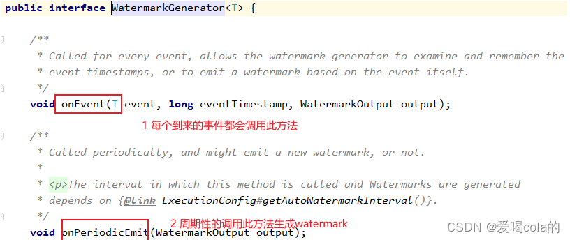 onPeriodicEmit方法会周期性触发,比每个元素生成一个watermark效率高,接收一个watermarkOutput类型的参数output,内部可以用output.emitWatermark方法生成一个watermark。周期时间为处理时间,可以调用环境配置的env.setAutoWatermarkInterval() 方法来设置,默认为200ms