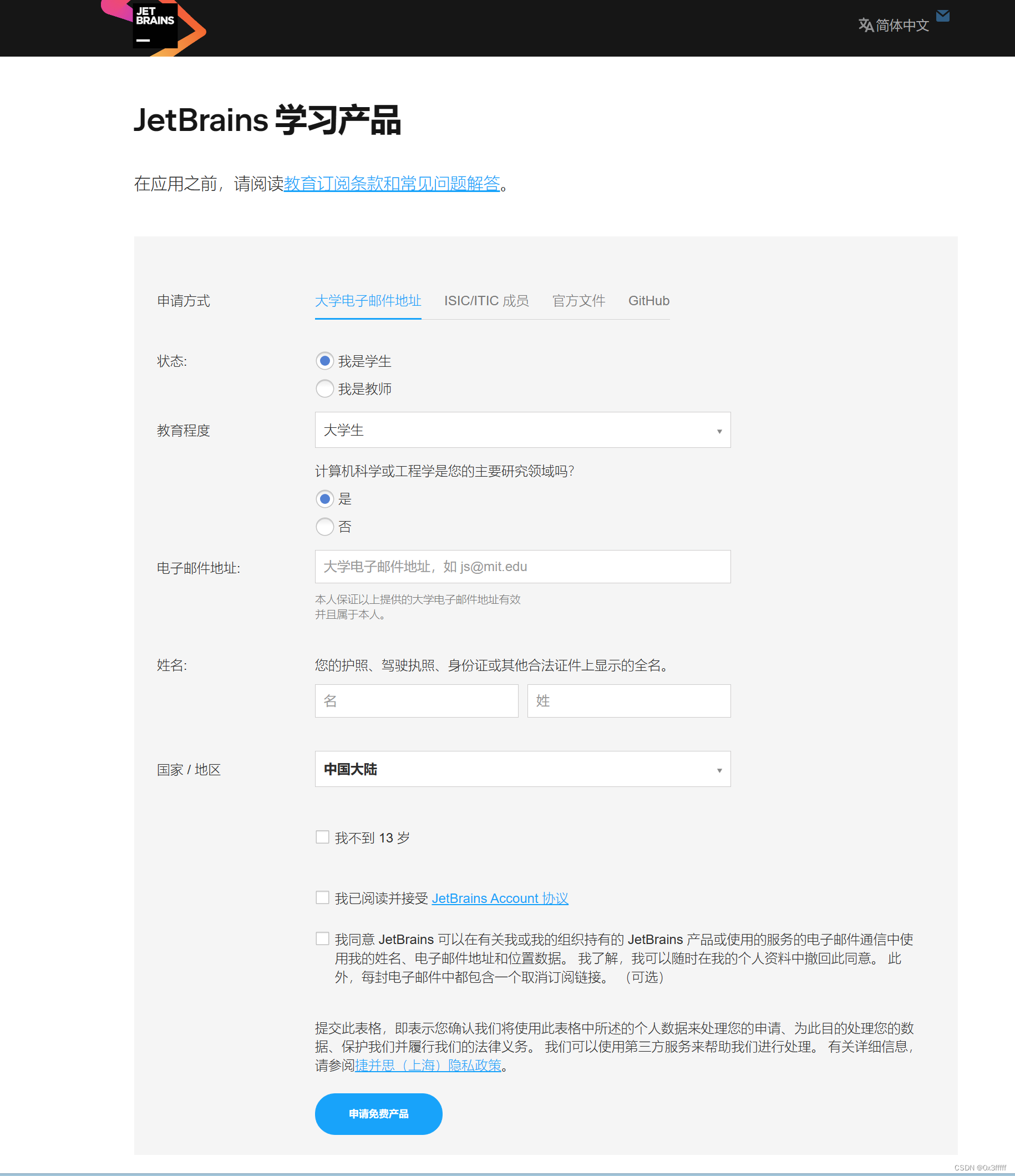 打开上面链接如实填写即可,邮箱填前面申请到的教育邮箱(使用学信网验证也可以,但是较慢)