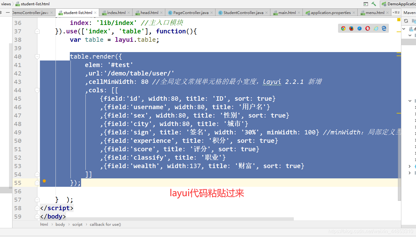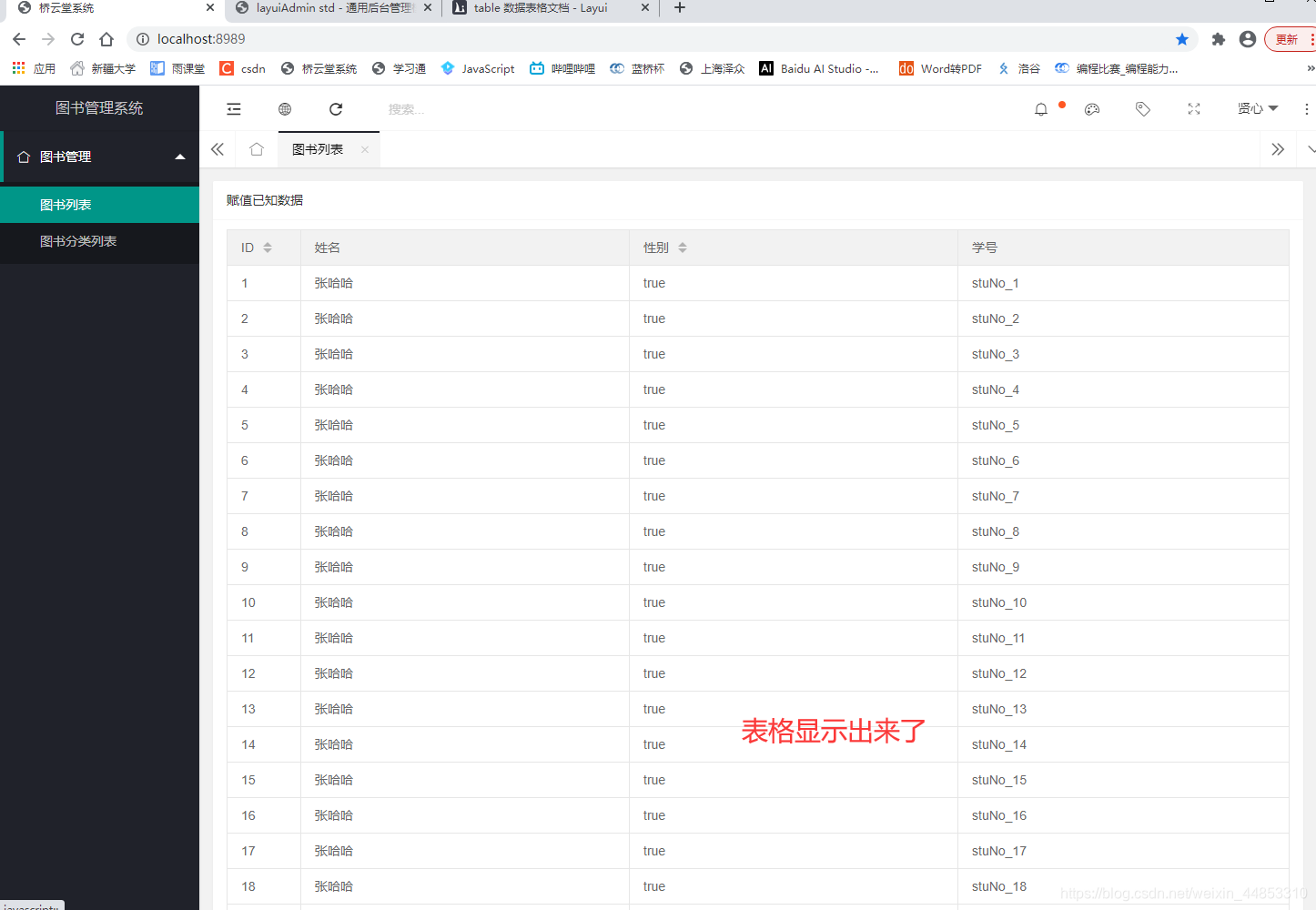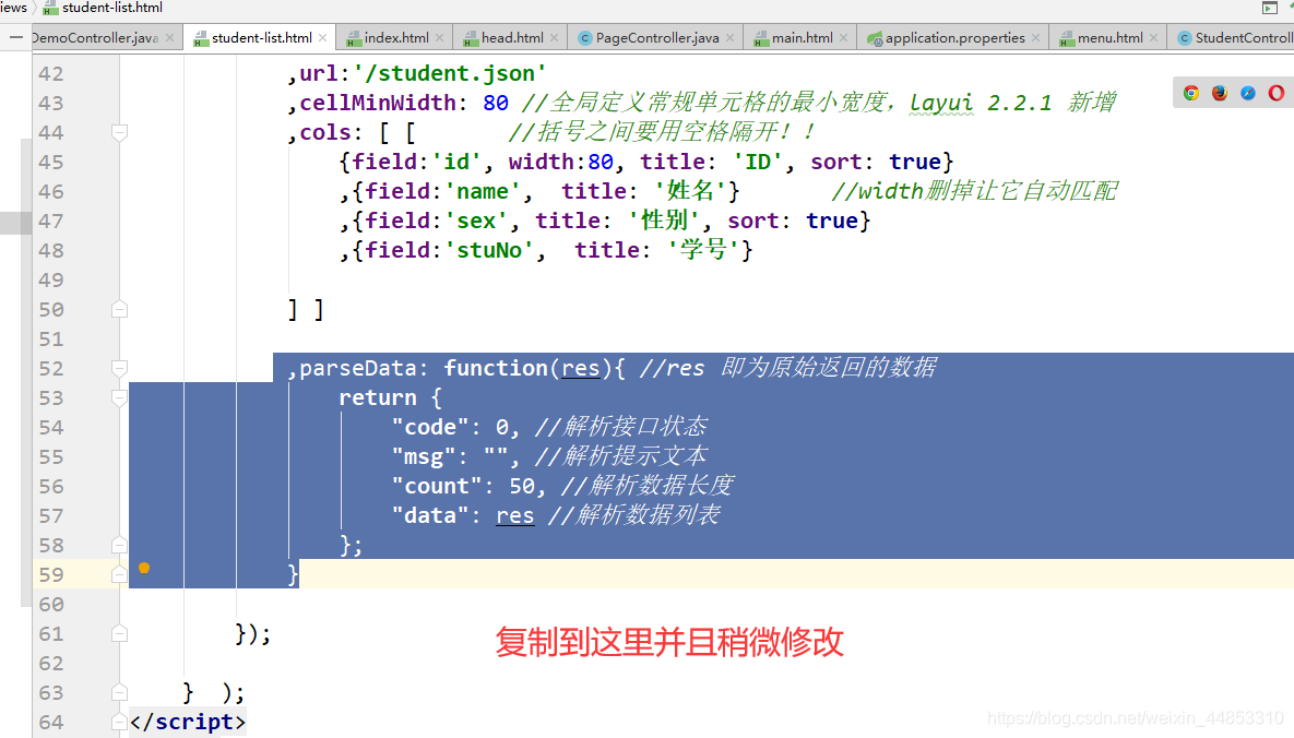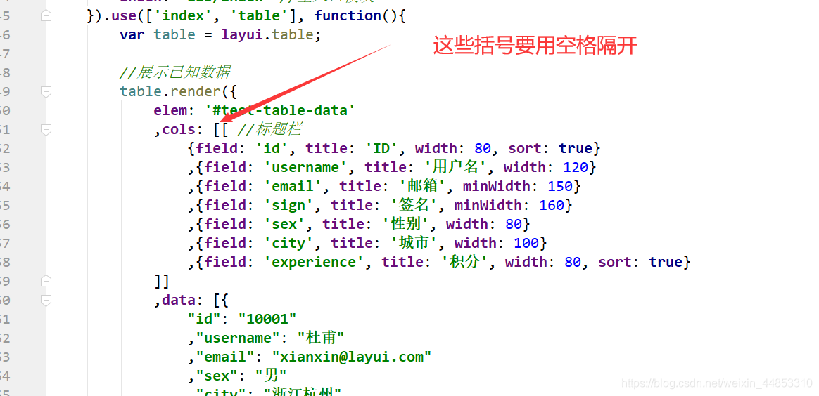 table.render({elem: '#table1',url:'/student.json',cellMinWidth: 80 //全局定义常规单元格的最小宽度,layui 2.2.1 新增,cols: [ [ //括号之间要用空格隔开!!{field:'id', width:80, title: 'ID', sort: true},{field:'name', title: '姓名'} //width删掉让它自动匹配,{field:'sex', title: '性别', sort: true},{field:'stuNo', title: '学号'}] ],parseData: function(res){ //res 即为原始返回的数据return {"code": 0, //解析接口状态"msg": "", //解析提示文本"count": 50, //解析数据长度"data": res //解析数据列表};}});
