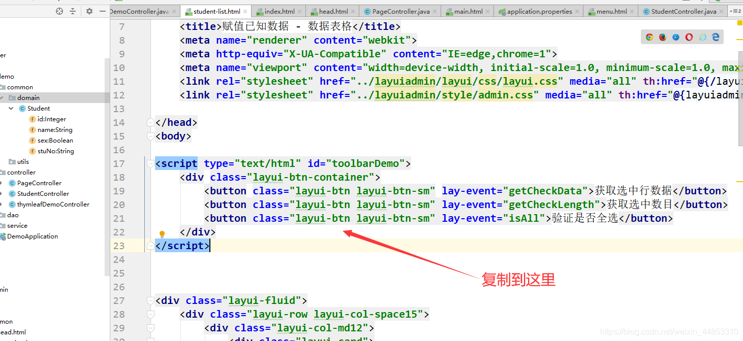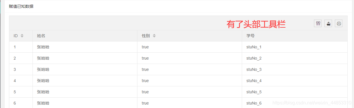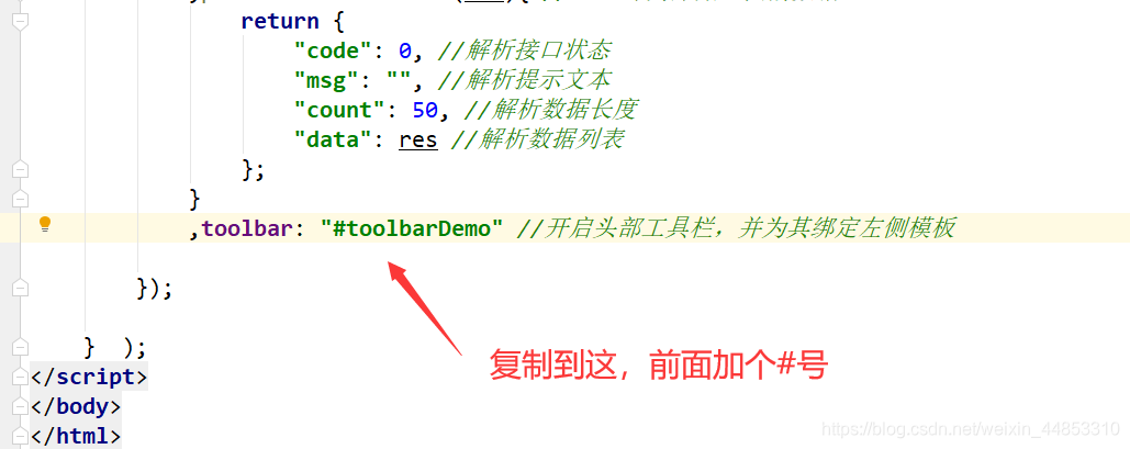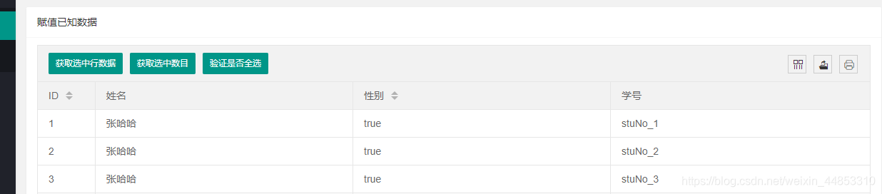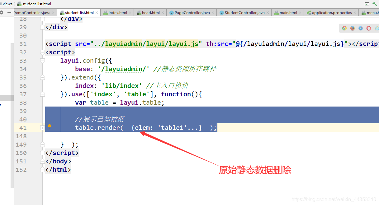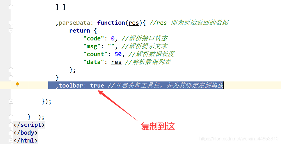 table.render({elem: '#table1',url:'/student.json',cellMinWidth: 80 //全局定义常规单元格的最小宽度,layui 2.2.1 新增,cols: [ [ //括号之间要用空格隔开!!{field:'id', width:80, title: 'ID', sort: true},{field:'name', title: '姓名'} //width删掉让它自动匹配,{field:'sex', title: '性别', sort: true},{field:'stuNo', title: '学号'}] ],parseData: function(res){ //res 即为原始返回的数据return {"code": 0, //解析接口状态"msg": "", //解析提示文本"count": 50, //解析数据长度"data": res //解析数据列表};}});