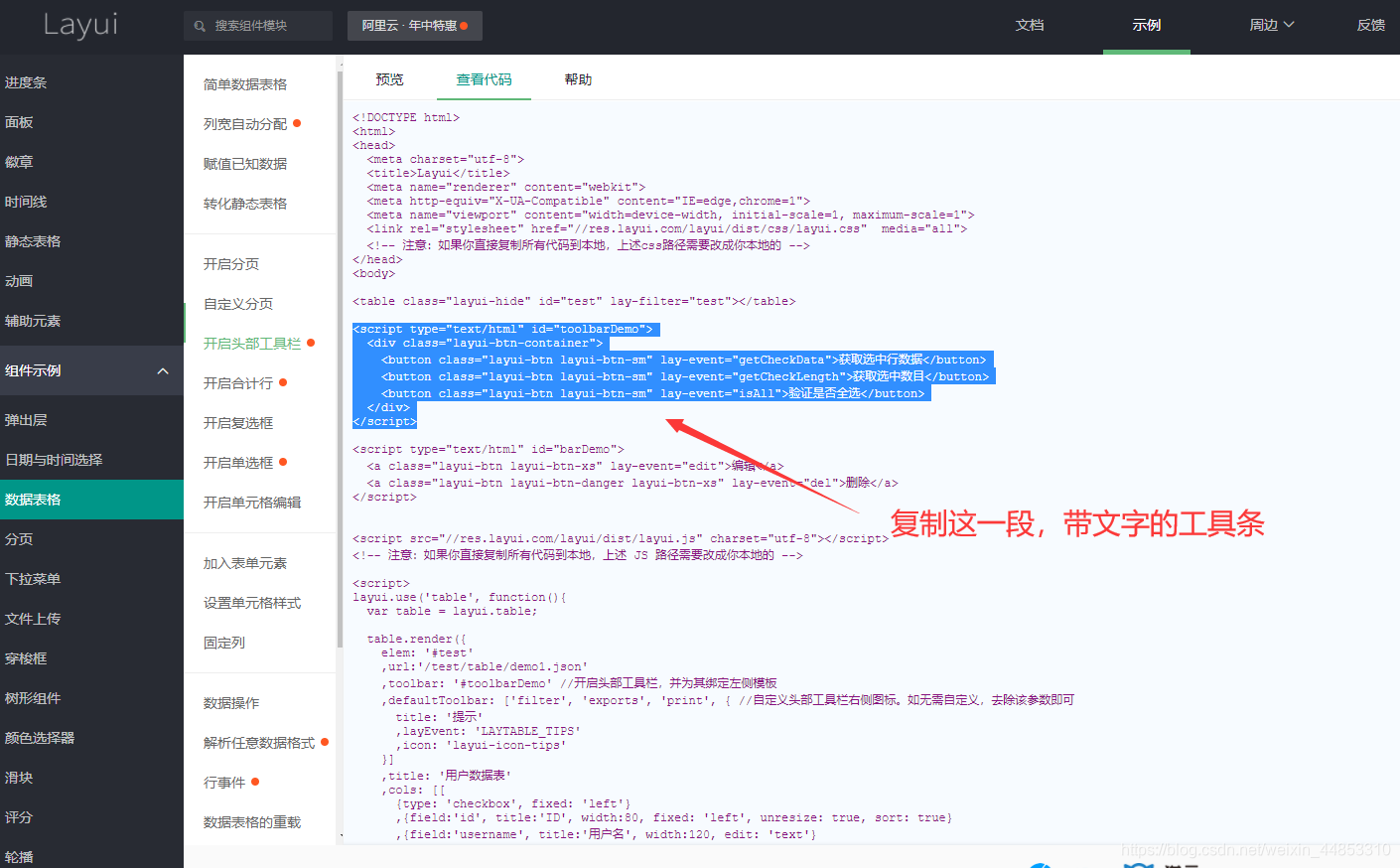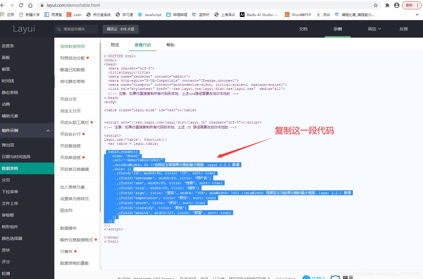 table.render({elem: '#test',url:'/demo/table/user/',cellMinWidth: 80 //全局定义常规单元格的最小宽度,layui 2.2.1 新增,cols: [[{field:'id', width:80, title: 'ID', sort: true},{field:'username', width:80, title: '用户名'},{field:'sex', width:80, title: '性别', sort: true},{field:'city', width:80, title: '城市'},{field:'sign', title: '签名', width: '30%', minWidth: 100} //minWidth:局部定义当前单元格的最小宽度,layui 2.2.1 新增,{field:'experience', title: '积分', sort: true},{field:'score', title: '评分', sort: true},{field:'classify', title: '职业'},{field:'wealth', width:137, title: '财富', sort: true}]]});
