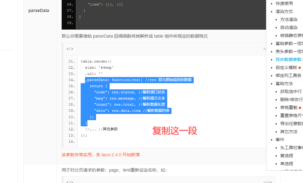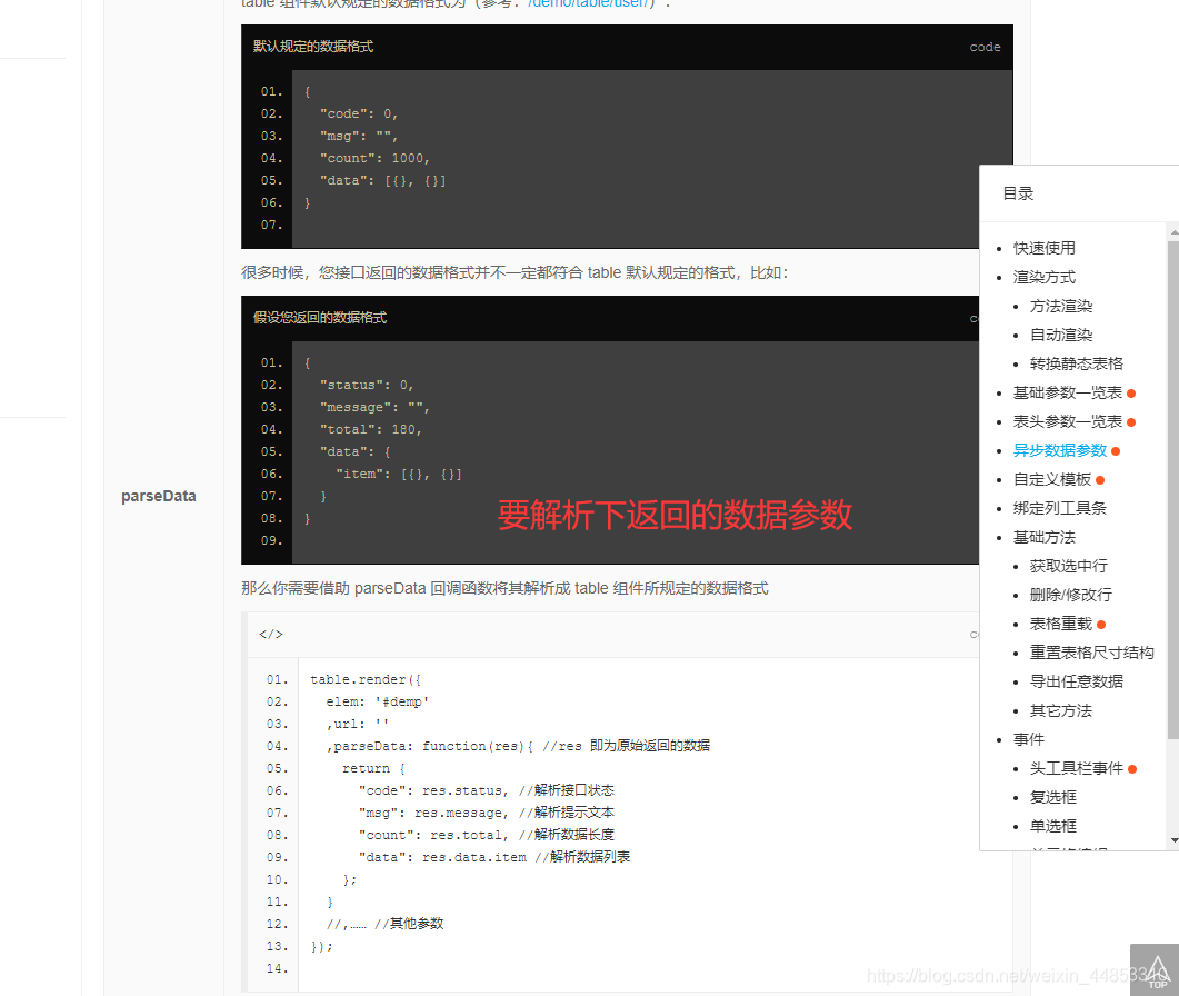 ,parseData: function(res){ //res 即为原始返回的数据return {"code": res.status, //解析接口状态"msg": res.message, //解析提示文本"count": res.total, //解析数据长度"data": res.data.item //解析数据列表};}