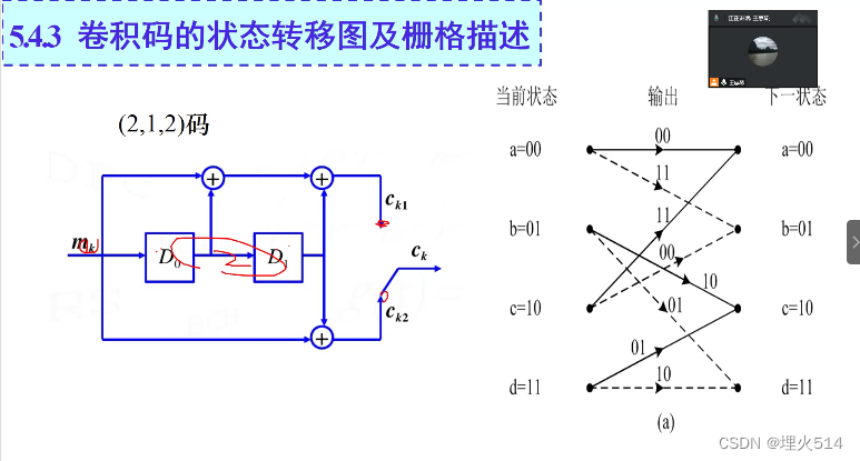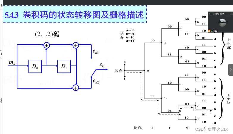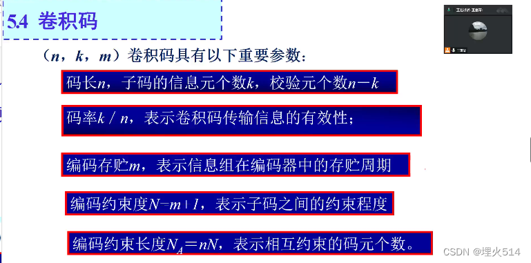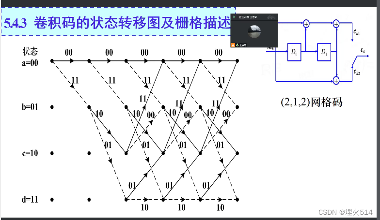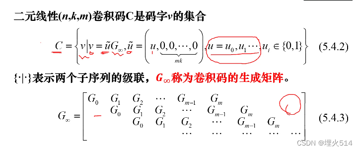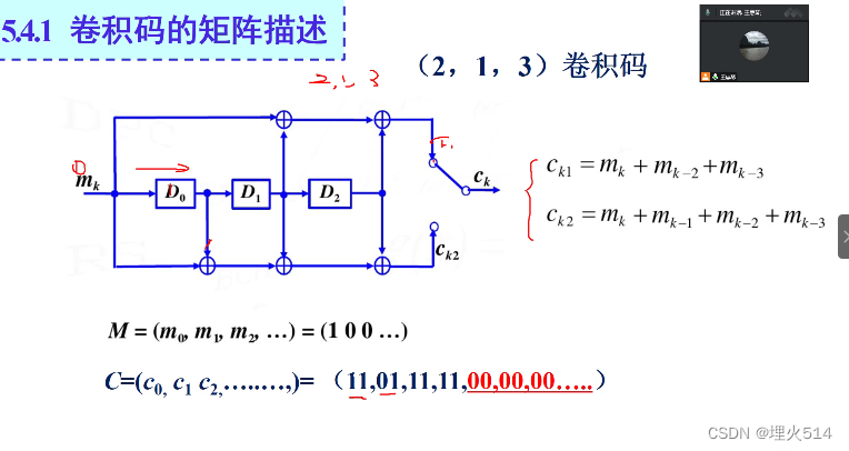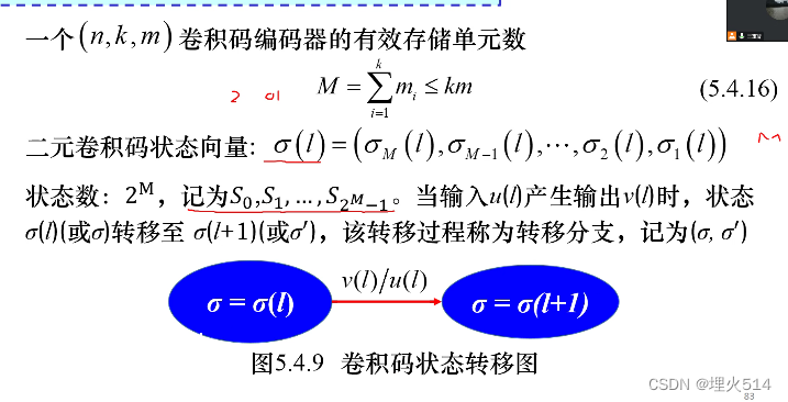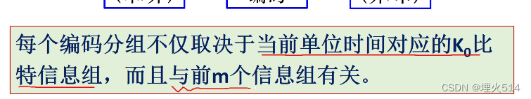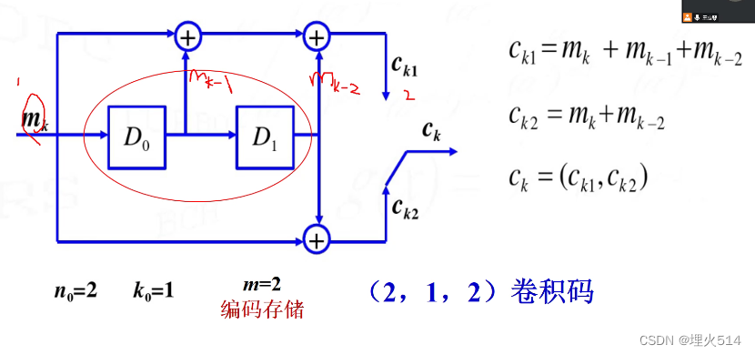 其中k为每次输入到卷积编码器的bit数,n为每个k元组码字对应的卷积码输出n元组码字,m为编码存储度(移位寄存器的个数),也就是卷积编码器的k元组的级数,称m+1= K为编码约束度m称为约束长度