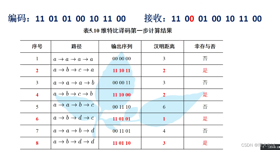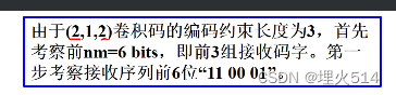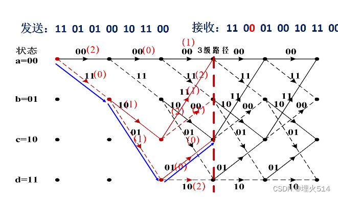 选出约束长度的编码,然后找出这个长度内各种可能的路径,并在路径中找出与收到编码汉明距离最小的,认为它是原本输入的编码
