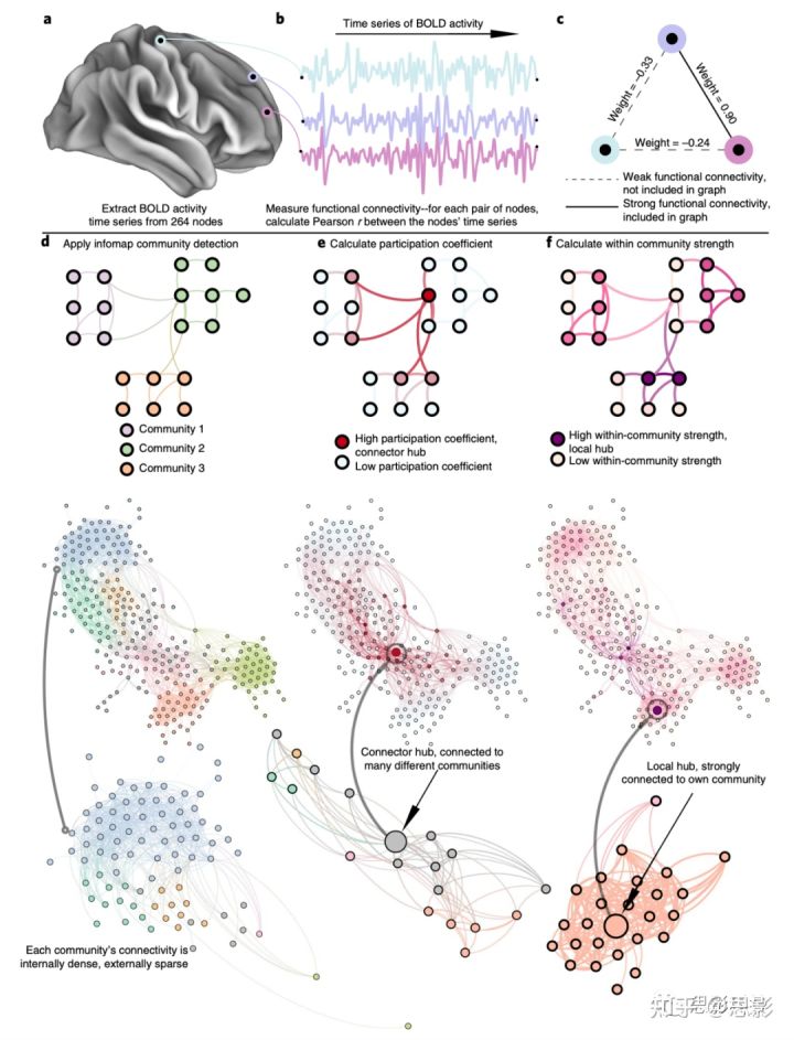 c、最强的(例如前5%的r值)功能连接作为图的加权边(图密度的范围已被探索,详细信息请参见方法介绍部分)。