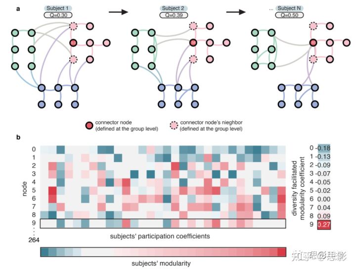 作者首先测试了跨被试的节点的参与系数是否与模块化系数Q呈正相关。对于每个节点,计算该节点的参与系数与跨被试的网络模块化值(Q)之间的Pearson相关系数R。直观上,R值越大,说明节点的多样性(即参与系数)越大,网络的模块化程度越高。这是一个重要的特征,可以用来区分大脑不同区域的作用。为了便于表示,本文将每个节点的R值称为多样性促进的模块化系数,因为它衡量了节点连接的多样性如何促进网络的模块化(本文使用这个术语来说明这两个关系无因果性)。对于每个节点,还计算了模块内强度与被试Q值之间的Pearson相关r。直观上,r值越大,说明节点的局部性(即模块内强度)越高,网络模块化程度越高。我们将每个节点的r值(在模块内强度和跨被试的Q值之间)称为局部促进模块化系数,因为它衡量的是节点连接的局部性如何促进网络的模块化。