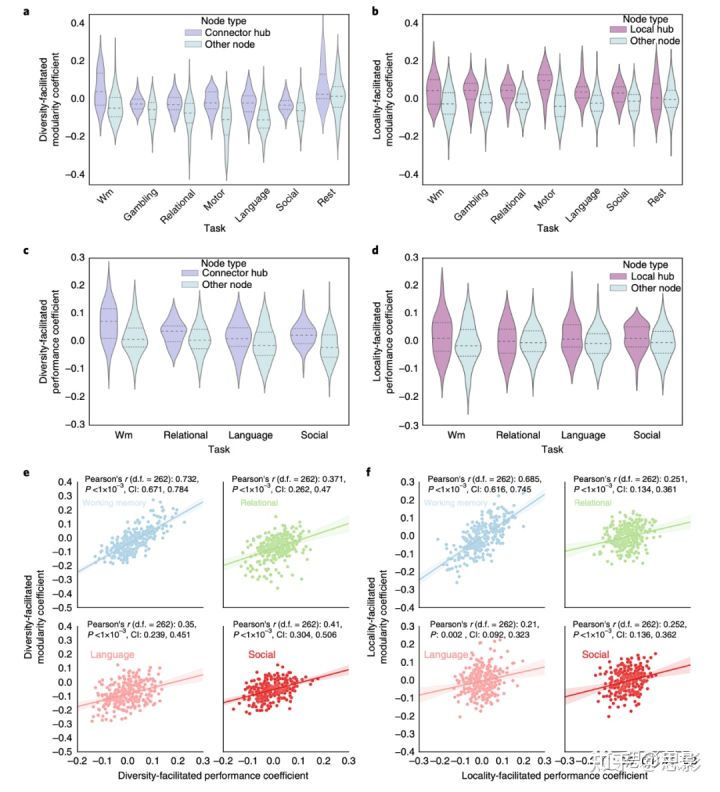此外,每个节点的多样性任务表现系数与每个节点的平均参与系数呈显著正相关,说明对于连接性中心而言,参与系数越高,任务表现越好。每个节点的局部促进任务表现系数与每个节点的平均模块内强度之间的Pearson r相关性也是正的且显著的(Bonferroni (n tests = 4) P = 0.081,未校正的P = 0.02),这表明,对于局部hubs,更高的模块内强度也与更高的任务表现相关。最后,节点多样性促进模块化系数与节点多样性任务表现系数显著正相关(图3e),节点局部性促进模块化系数与节点局部性促进性能系数显著正相关(图3f)。因此,不同的连接性中心与更高的任务表现相关,与它们促进更高的模块化的程度成正比。这表明不同hubs促成的网络模块化的增加与提高的任务表现之间存在很强的相关性。
