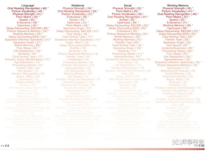 所有的预测指标都是经过先验选择的。在工作记忆任务中,使用了所有n-back条件下(脸、身体、位置、工具)的平均准确率。在相关匹配任务中,在匹配条件和关系条件中都使用了平均正确率。对于语言任务,采用了该任务在数学和语言条件下所达到的最大难度。本研究没有使用判断准确性,因为任务的难度取决于被试的表现,因此,对这些任务的准确性不是一个标准的衡量标准。对于社会任务,考虑到几乎所有被试都正确地将社会互动识别为社会互动,使用了正确识别随机互动的百分比。