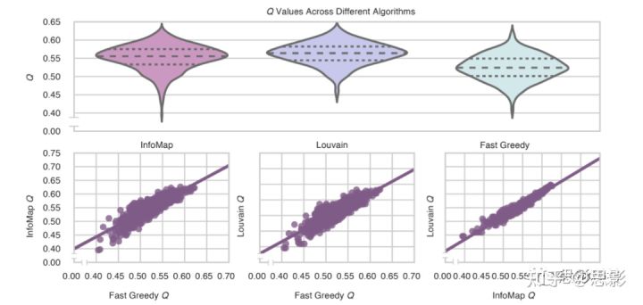 对于每个任务,执行Infomap算法。虽然该方法已被证明在已知模块结构的基准网络上具有很高的准确性,但它仍然是一种启发式方法,因为模块检测是非确定性多项式的。虽然Infomap并没有明确地最大化Q值,但它已在几个测试案例中准确地估计了模块结构,使Q值、参与系数和基于模块结构计算的模块内强度准确有效。此外,在生物网络中,Infomap实现的Q值类似于最大化Q的算法;在当前静息态数据中,Infomap Q值与FastGreedy Q值的Pearson相关 r = 0.87 (d.f = 474, P < 0.001, 95% CI: 0.84, 0.89);通过独立t检验发现,Infomap Q值高于Fast-Greedy Q值(t (d.f: 952): 16.027, P < 0.001,Cohen’s d: 0.775, 95% CI: 0.024, 0.03)。Infomap Q值与Louvain Q值在Pearson相关r = 0.98 (d.f = 474, P < 0.001, 95% CI: 0.97, 0.98); Louvain Q值高于Infomap Q值。当将Infomap Q值与包含Louvain和Fast-Greedy(两种明确最大化Q的算法)的分布进行比较时,通过独立t检验(t (d.f: 1429): 5.304, P < 0.001, Cohen’s d: 0.222, 95% CI: 0.005, 0.011),Infomap Q值显著更高。无论如何,本文使用Infomap检测到的模块结构与其他方法的Q值高度相似(补图15)。此外,以往的工作已经证明了模块检测的稳定性和参与系数跨模块检测方法。