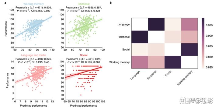 a、对于每个任务,由节点的多样性、局部性、模块性和网络连接作为特征的预测模型预测的任务表现和真实的任务表现之间的相关性。每个数据点代表受试者的(y轴)真实表现和由神经网络预测的受试者的(x轴)表现。阴影区域代表95%的CIs。在每项任务中,预测模型都显著预测了任务表现(p . <1⨯10-3,Bonferroni校正(n次测试= 4),N=工作记忆:473,关系:457,语言和数学:471,社交:473)。