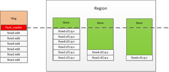 如下图所示,我们假定该RegionServer上仅有一个Region,由于不同的Row是在列簇上有所区别,就会出现有些不同Store内占用的内存不一致的情况,这里会根据整体内存使用的情况,或者RS使用内存的情况来决定是否执行Flush操作。如果仅仅刷入使用内存较大的memstore,那么在使用的过程中,一是Scan操作在执行时就不够统一,二是在HLog Replayer还原Region内Memstore故障前的状态,只需根据Hlog的Flush_marker的标记位来执行Replay即可。