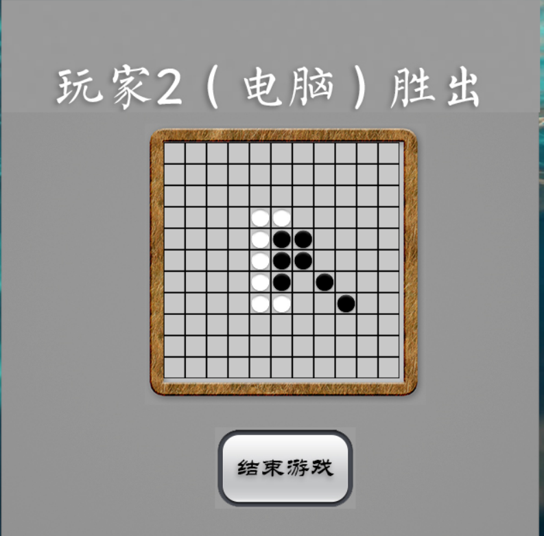 {if (ai3() == 1)return 0;//计分归零for (int i = 0; i < length; i++){for (int j = 0; j < length; j++){score[i][j] = 0;}}//每个子计分for (int i = 0; i < length; i++){for (int j = 0; j < length; j++){if (map[j][i] == 2){score[j][i] = -1;continue;}if (map[j][i] == 1){score[j][i] = -1;continue;}score[j][i] += aibeside(j, i);score[j][i] += aibeside2(j, i);score[j][i] += aibeside3(j, i);score[j][i] += aibeside4(j, i);score[j][i] += corner(j, i);score[j][i] += attack(j, i);}}back:int maxx = 0, maxy = 0, maxscore = 0;for (int j = 0; j < length; j++){for (int i = 0; i < length; i++){if (score[j][i] > maxscore){maxscore = score[j][i];maxx = j;maxy = i;}}}if (map[maxx][maxy] != 0){score[maxx][maxy] = 0; goto back;}map[maxx][maxy] = 2;positionx = maxx;positiony = maxy;IsBlack = 1;return 0;