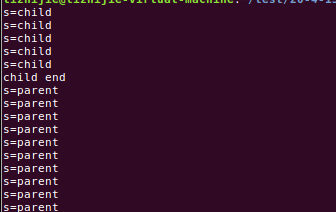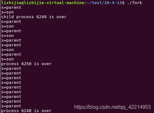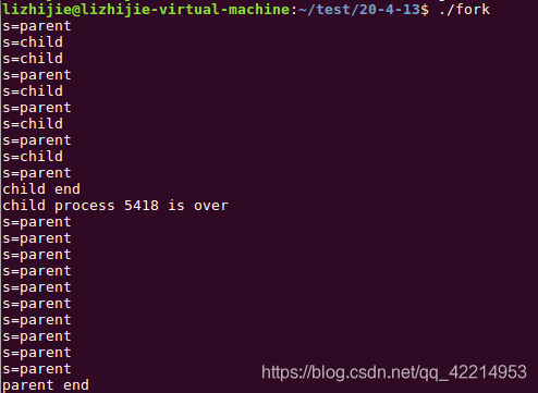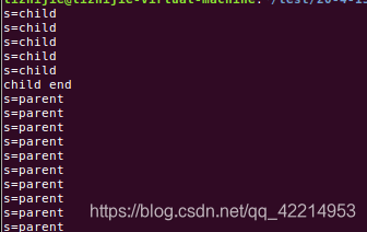 上述程序,在子进程结束之前,父进程一直在do while语句里面执行,并没有挂起。程序执行结果如下如所示: