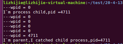 {pid_t pid, wpid;pid = fork();if(pid == -1){perror("fork error");exit(1);} else if(pid == 0){ //sonprintf("I'm process child, pid = %d\n", getpid());sleep(5); exit(0);} else { //parentdo {wpid = waitpid(pid, NULL, WNOHANG);//wpid = wait(NULL);printf("---wpid = %d\n", wpid);if(wpid == 0){printf("NO child exited\n");sleep(1); }} while (wpid == 0); //子进程不可回收if(wpid == pid) //回收了指定子进程printf("I'm parent, I catched child process,""pid = %d\n", wpid);return 0;