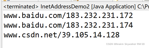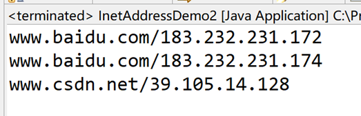 public class InetAddressDemo2 {public static void main(String[] args)throws Exception {//获取网站www.baidu.com的IP地址String host = "www.baidu.com";InetAddress addresses [] = null; addresses=InetAddress.getAllByName(host);//获取网站www.csdn.net的IP地址for (InetAddress address : addresses)System.out.println(address);host = "www.csdn.net";addresses=InetAddress.getAllByName(host);//获取网站www.csdn.net的IP地址for (InetAddress address : addresses)System.out.println(address);}