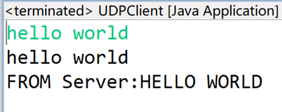 class UDPClient { public static void main(String args[]) throws Exception { BufferedReader inFromUser = new BufferedReader(new InputStreamReader(System.in)); DatagramSocket ClientSocket = new DatagramSocket(); InetAddress IPAddress = InetAddress.getLocalHost(); byte[ ] sendData = new byte[1024]; byte[ ] receiveData = new byte[1024]; String sentence = inFromUser.readLine(); System.out.println(sentence);sendData = sentence.getBytes(); DatagramPacket sendPacket = new DatagramPacket(sendData, sendData.length, IPAddress, 9876); ClientSocket.send(sendPacket); DatagramPacket receivePacket = new DatagramPacket(receiveData, receiveData.length); ClientSocket.receive(receivePacket); String modifiedSentence = new String(receivePacket.getData()); System.out.println("FROM Server:" + modifiedSentence); ClientSocket.close(); }