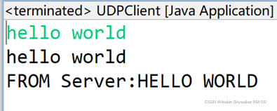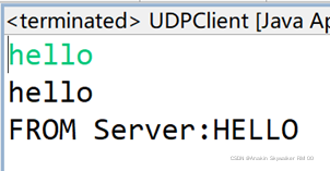 在循环当中,要先清空receiveData中原有的数据,所以使用receivedata = new byte [1024];来进行清空。使用DatagramPacket类来接收从客户端传输过来的数据,并将传输过来的数据存放到receiveData中。将数据存放到String类型的对象sentence当中。接着从recievePacket中获取客户端的IP地址和端口号,并存放在InetAddress类的IPAddress对象中和int类型的port变量中。接着将sentence中的数据字母大写,再用sendData发送给客户端。