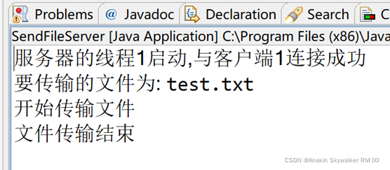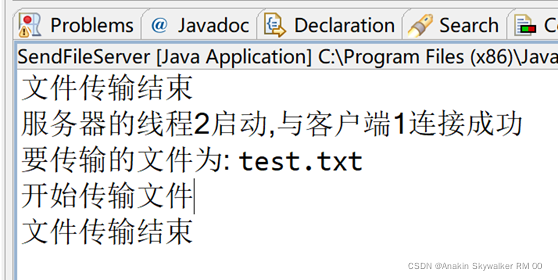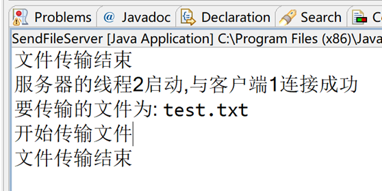 public class SendFileServer implements Runnable{private static final int MONITORPORT = 12345;private Socket s ;public SendFileServer(Socket s) {super();this.s = s;}public static void server(){try {ServerSocket ss = new ServerSocket(MONITORPORT);int i=0;while(true){i++;Socket s = ss.accept();System.out.println("服务器的线程"+i+"启动,与客户端1连接成功");new Thread(new SendFileServer(s)).start();}} catch (IOException e) {e.printStackTrace();}}public static void main(String[] args) {SendFileServer.server();}@Overridepublic void run() {byte[] buf = new byte[100];OutputStream os=null;FileInputStream fins=null;try {os = s.getOutputStream();String fileName = "test.txt";System.out.println("要传输的文件为: "+fileName);os.write(fileName.getBytes());System.out.println("开始传输文件");fins = new FileInputStream(fileName);int data;while(-1!=(data = fins.read())){os.write(data);}System.out.println("文件传输结束");} catch (IOException e) {e.printStackTrace();}finally{try {if(fins!=null) fins.close();if(os!=null) os.close();this.s.close();} catch (IOException e) {e.printStackTrace();} } }