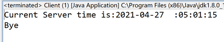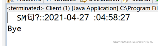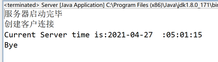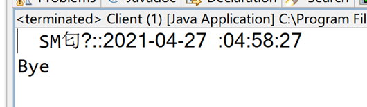 同理在下面发送“Bye\n”和接受数据时与上述一样。全部执行完毕后关闭输入输出流和TCP连接。