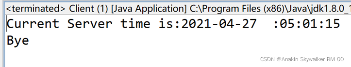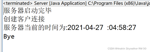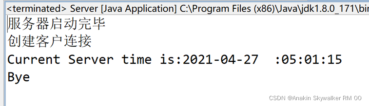 向服务器端输出Byte类型的数据“Time\n”,接下来进入一个循环。因为在实验的时候会发现服务端对客户发送的数据会先发送一个空白的数据,所以我先进入一个循环,直到接受的数据不是空白的,输出该数据并且跳出这个循环。