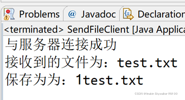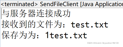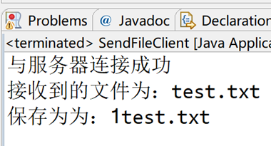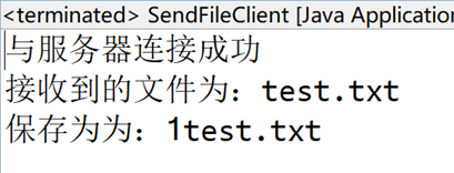 public class SendFileClient {private static final String SERVERIP = "127.0.0.1";private static final int SERVERPORT = 12345;private static final int CLIENTPORT = 54321;public static void main(String[] args) {byte[] buf = new byte[100];Socket s = new Socket();try {s.connect(new InetSocketAddress(SERVERIP,SERVERPORT), CLIENTPORT);System.out.println("与服务器连接成功");InputStream is = s.getInputStream();int len = is.read(buf);String fileName = new String(buf,0,len);System.out.println("接收到的文件为:"+fileName);System.out.println("保存为为:"+"1"+fileName);FileOutputStream fos = new FileOutputStream("1"+fileName);int data;while(-1!=(data = is.read())){fos.write(data);}is.close();s.close();} catch (IOException e) {e.printStackTrace();}}