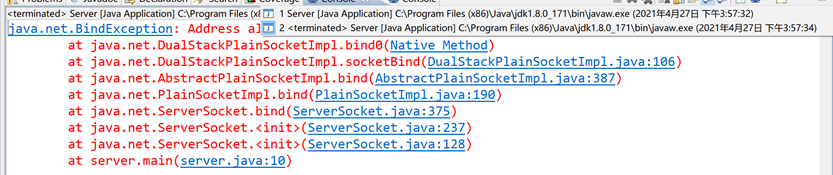 要特别注意的是服务器端必须在之前的程序执行结束后在开启,否则会提示端口号已被占用。
