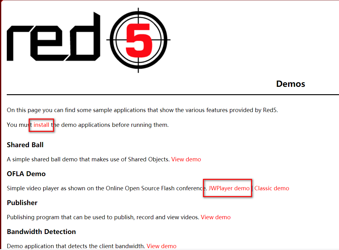 如果demo没安装,则点击install进行安装,如果已经安装OFLA Demo,则直接点击JWPlayer demo打开。