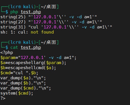 2.经过escapeshellarg处理后变成了'127.0.0.1'\'' -v -d a=1',即先对单引号转义,再用单引号将左右两部分括起来从而起到连接的作用。