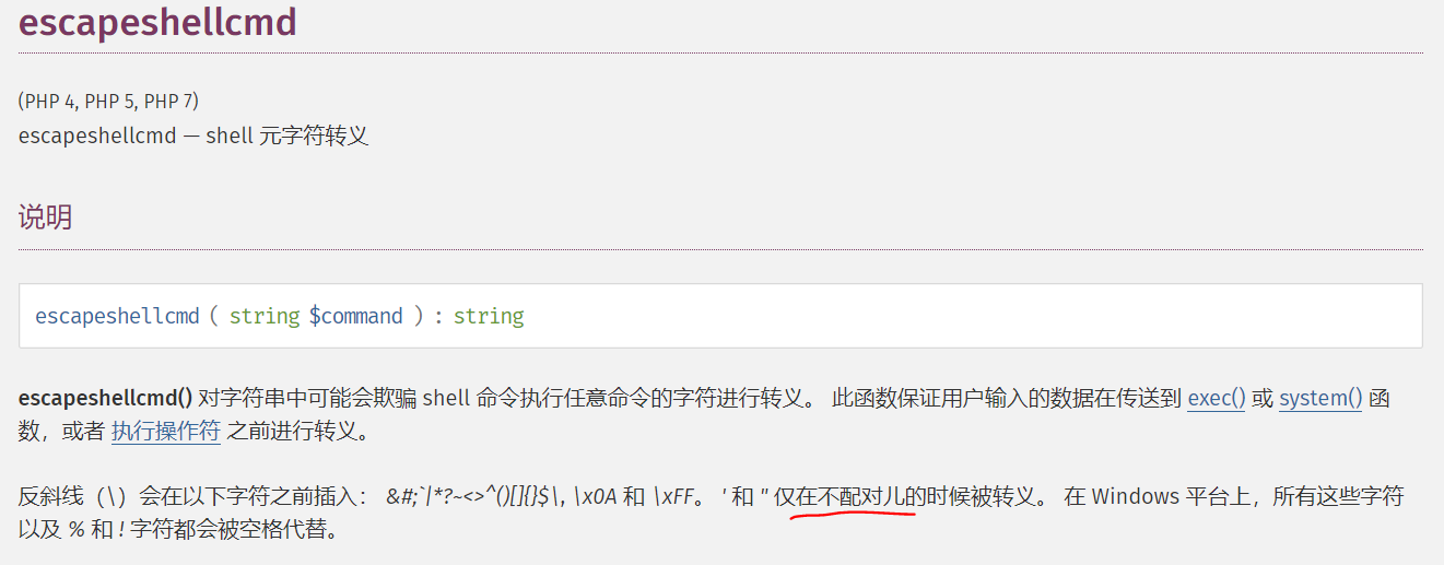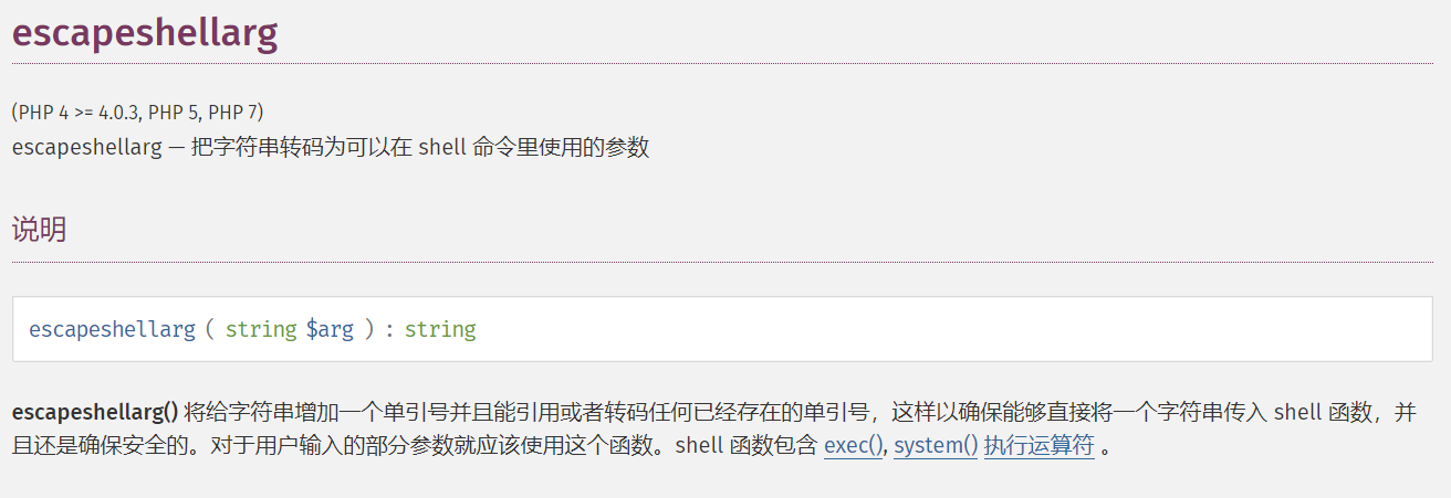 源码中只要用到了escapeshellarg()函数和escapeshellcmd()函数,经过搜索这两个函数我们来了解这两个函数: