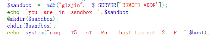 echo system("nmap -T5 -sT -Pn --host-timeout 2 -F ".$host);