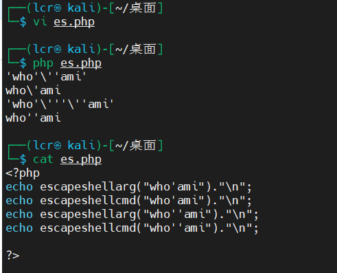 对于单个单引号, escapeshellarg 函数转义后,还会在左右各加一个单引号,但 escapeshellcmd 函数是直接加一个转义符,对于成对的单引号, escapeshellcmd 函数默认不转义,但 escapeshellarg 函数转义: