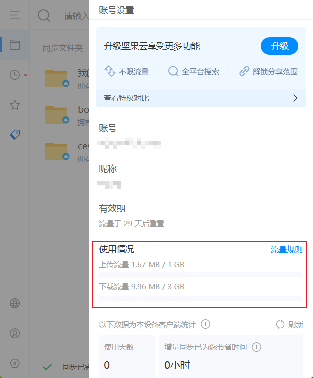 坚果云每月免费流量不多,如下图,但是对于书签同步来说足够了