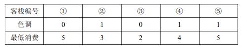 2 人要住同样色调的客栈,所有可选的住宿方案包括:住客栈①③,②④,②⑤,④⑤,但是若选择住 4 , 5 4,5 4,5号客栈的话, 4 , 5 4,5 4,5 号客栈之间的咖啡店的最低消费是 4 4 4 ,而两人能承受的最低消费是 3 3 3 元,所以不满足要求。因此只有前 3 3 3 种方案可选。