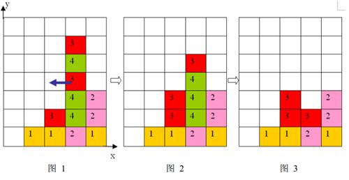 - 任一时刻,如果在一横行或者竖列上有连续三个或者三个以上相同颜色的方块,则它们将立即被消除(参见图1 到图3)。