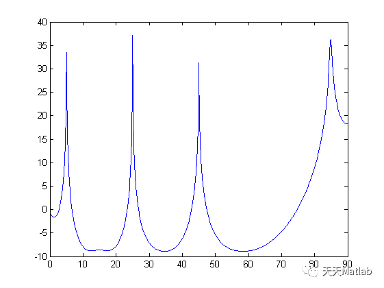 clcclear allclose allw=2*pi*1800000000;%信源载波圆频率d=0.16;%天线振元间距c=3.0e+08;%光速u=[5 25 45 85]*pi/180;%来波方向角kp=1024;%快拍数md=8;%天线振元数nd=4;%信号源数目snr=10;%信噪比snr1=10^(snr/20);bc=0.1;%空间谱峰搜索步长for i=1:mdfor m=1:ndfor k=1:kps(m,k)=snr1*exp(-j*2*pi*m*64*k/8192);%构成信号矩阵no(i,k)=exp(-j*2*pi*rand(1));%构成噪声矩阵endt=d/c*sin(u(m));a(i,m)=exp(-j*(i-1)*w*t);%构成方向矩阵endendfor i=2:(90/bc-1)while (pu(i)>pu(i-1)) & (pu(i)>pu(i+1)),n=n+1;dd(n)=pu(i);df(n)=i*bc;breakendendm=0;for i=1:nif dd(i)>0m=m+1;s1(m)=df(i);endends1%显示所估计出的方向值%-------------------------------------------------------------------