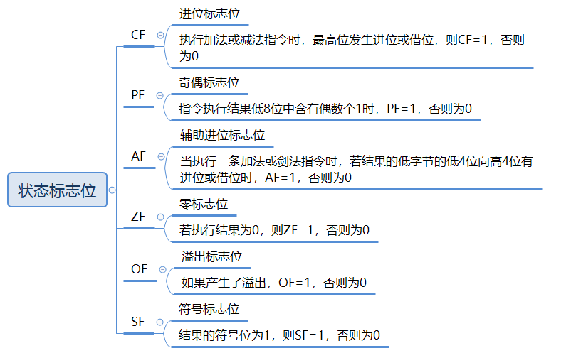 标志寄存器分为两大类:状态标志位和控制标志位。每一个标志位都用1个比特表示,也就是说,每个标志位只有0和1两个值。