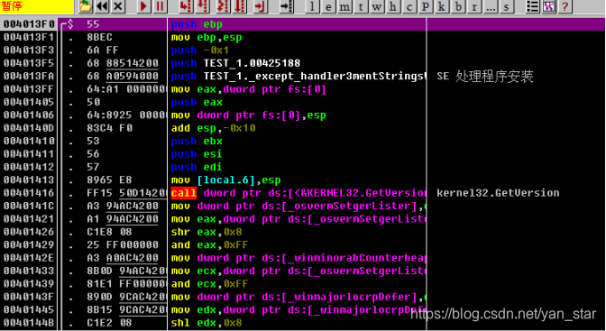 OD暂停在了程序的入口点,但是值得我们注意的是,这个不是main函数的入口点,而是编译器预先处理函数的暂停之处,往下拉,进入真正函数开始的地方: