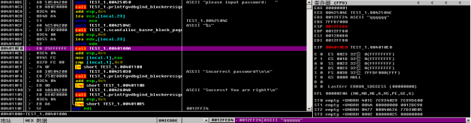 函数返回,main函数中一看ret_num是0,就会判断结果正确,下面我们看下输入qqqqqqqq情况的堆栈图