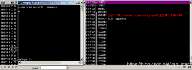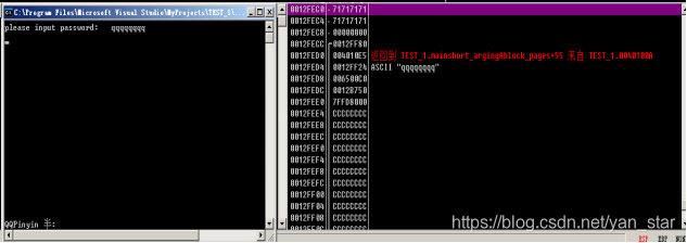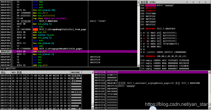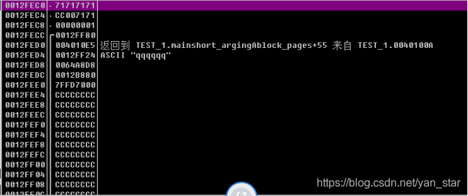 其中0012FEC0地址处的数据71就是q的ASCII码表现形式,一共输入了6个q所以看到6个71,又因为代码部分是先将ret_num变量进行入栈,且作为strcmp函数的返回值,strcmp(C/C++函数,比较两个字符串,设这两个字符串为str1,str2,若str1==str2,则返回零;若str1