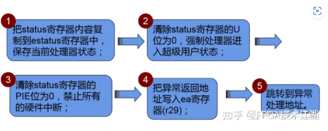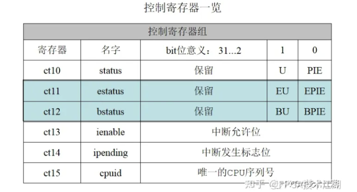 当执行异常返回指令(eret)后,处理器会把estatus寄存器(ctl1)内容复制到status寄存器(ctl0),恢复异常前的处理器状态,然后把异常返回地址从ea寄存器(r29)写入程序计数器。